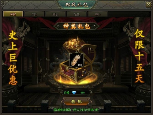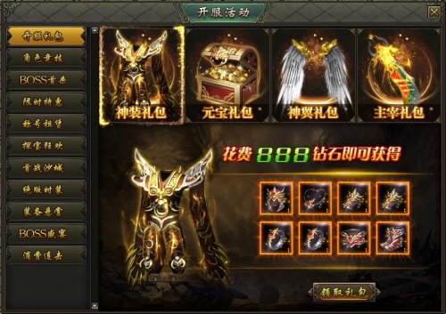 活动内容:活动期间,可以花费少量元宝购买极品神装礼包以及各种稀有道具,快速提升实力!