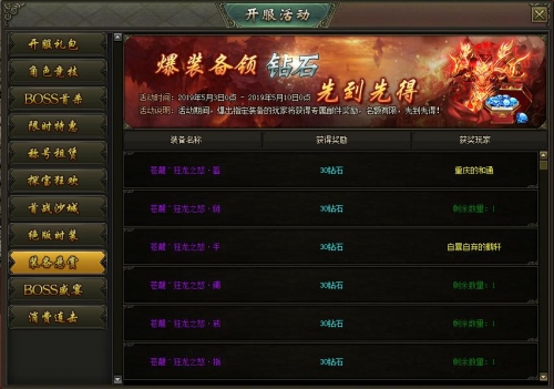 活动内容:活动期间,通过击杀BOSS首次掉落指定装备的玩家,可以获得丰厚的钻石奖励!