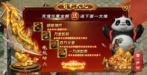活动内容:充值任意金额,即可免费获得20阶绝版神兵、拾取精灵万宝盼盼(唯一产出)、100万元宝等超级豪礼,绝对是史上最优惠,没有之一!