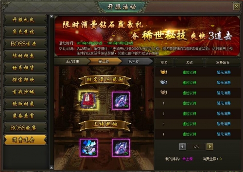 活动内容:活动期间,当日消费钻石达到5万钻石即可获取排行奖励,排名第1的玩家将获得稀世技能书奖励,超值消费,爽快3连击!