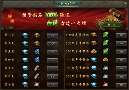 活动内容:活动期间,参与七日投资,投资金额按天数100%返还,并且可以额外获得海量极品材料奖励!