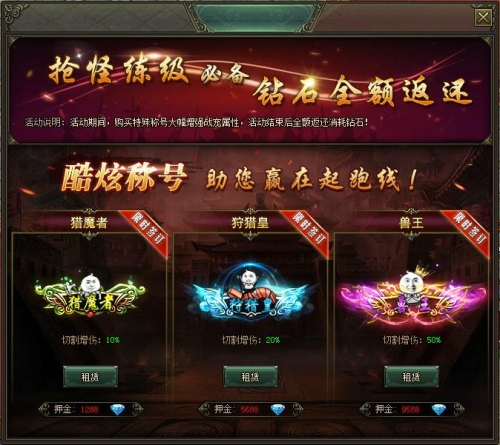 活动内容:活动期间,租赁限时炫酷称号,切割伤害瞬间飙升,击杀BOSS速度急速提升,并且开服第8天消费钻石全额返还!