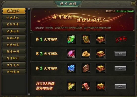 活动说明:活动期间,登陆游戏可领取不同天数的奖励,连续3天登陆可再领取额外奖励
