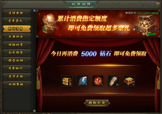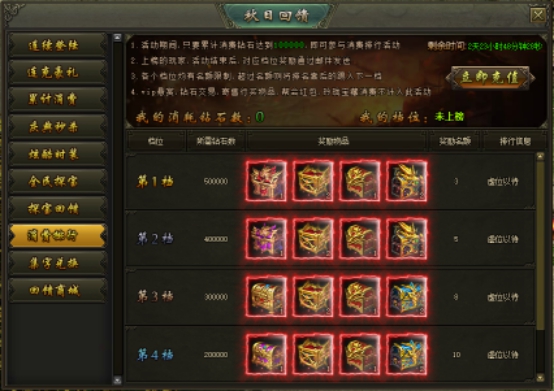 活动说明:活动期间,累计消费达到100000钻石的玩家参与排行,达到对应档位的玩家奖励在活动结束后以邮件的方式进行发放