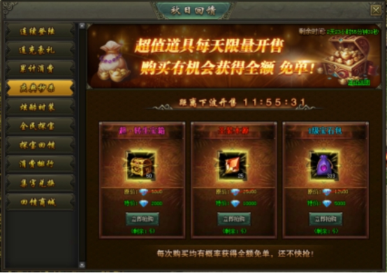 活动说明:活动期间,超值道具每天限量开售,购买就有机会获得全额免单!