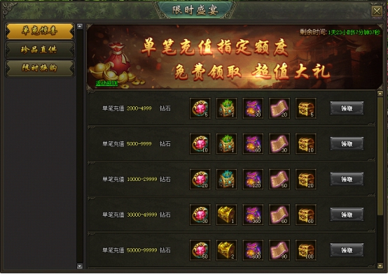 (2)活动一单充惊喜:活动期间,单笔充值达到指定档位的玩家可领取对应奖励