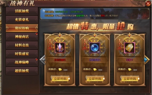 3. 限时抢购:活动期间,每日刷新多种超值特惠礼包,每个礼包限购1次。