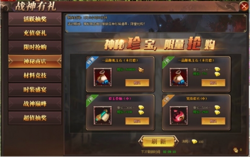 4. 神秘商店:活动期间,每2小时刷新各种珍稀折扣道具,可通过使用刷新令或金钻立即刷新。